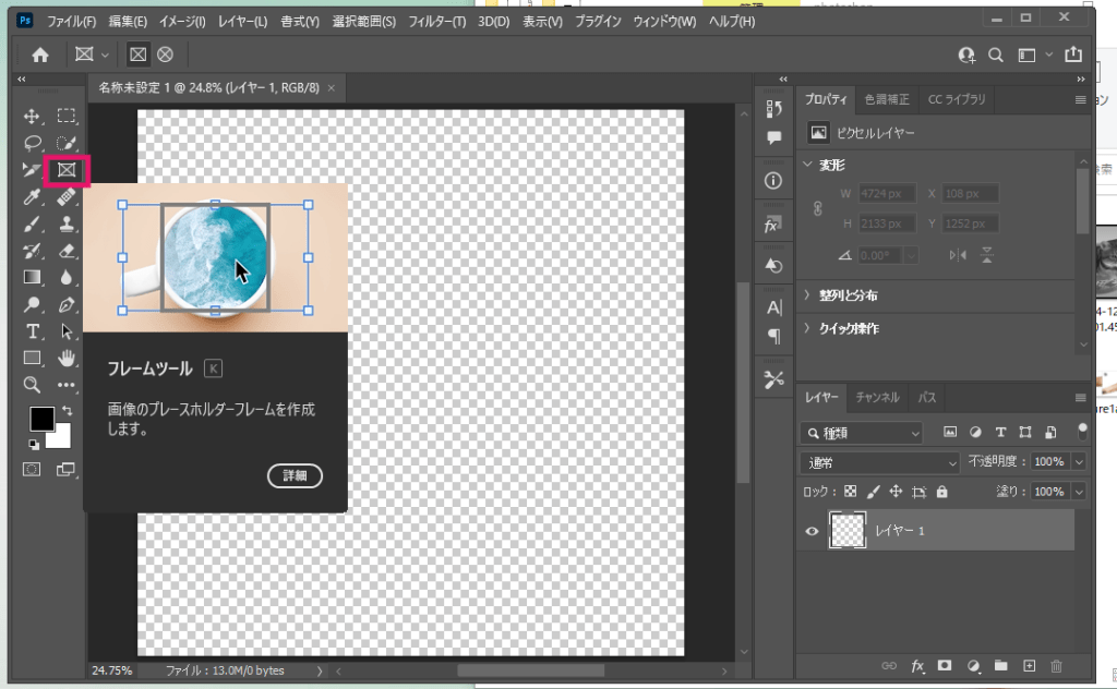 - ドラッグドロップで事前に用意した(1~4で作成した)画像(300ppi/tif形式)を6で作成したフレームに投げ入れる