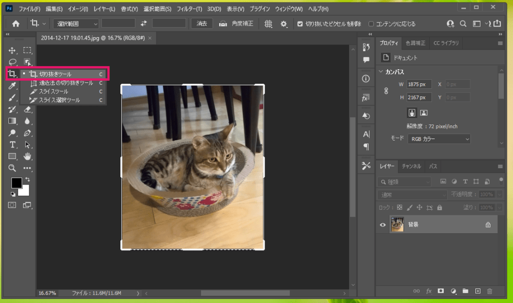 左ツールバーにある「切り抜きツール」をクリックすると対応する「オプション」がメニューバー下に表示される。