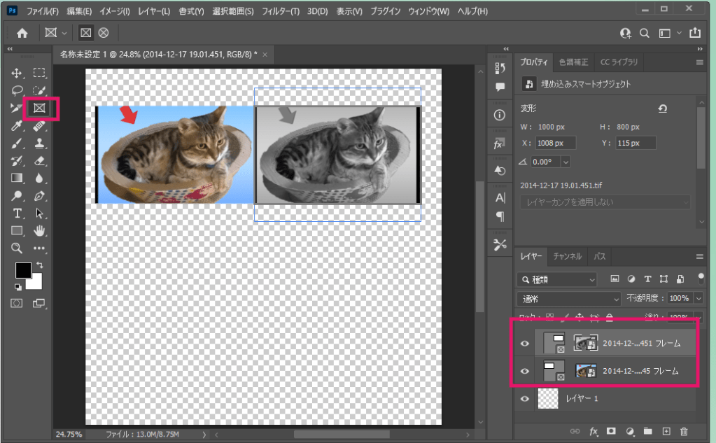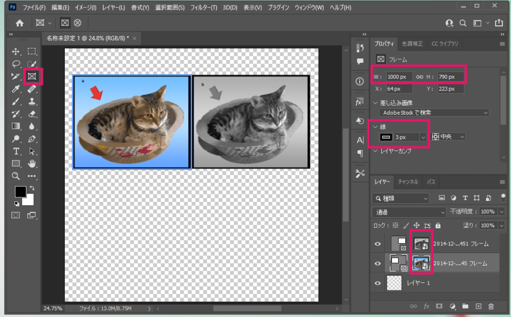 6. キャンバス上にフレームツールを使って複数画像を並べて揃える、枠線の太さを変える
